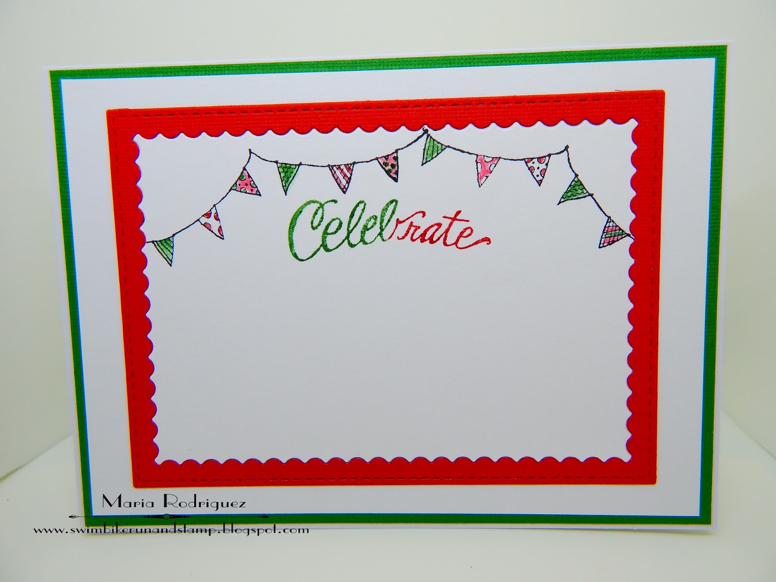 I used two sets from Flourishes for this panel, the banners are from the set "S'more Fun" and the word "Celebrate" from a Power Poppy set called "Marcella's Mixtape Vol. 1", I used Garden Green and Real Red Stampin' Up! markers to ink it up.
